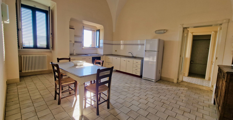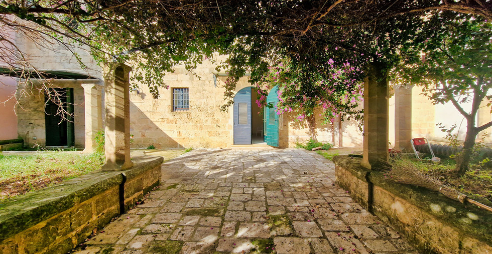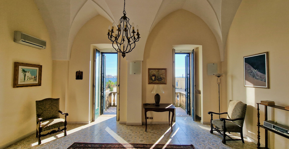 Le due stanze da letto del piano, disimpegnate alla perfezione rispetto alla zona giorno, sono una vera e propria meraviglia per gli occhi, con una composizione alchemica di elementi in grado di custodire alla perfezione la purezza evocativa dei volumi, con un linguaggio sensoriale arricchito da mobili di gran pregio e lampadari che rovesciano le forme diventandone quasi la proiezione grafica. Alla comodità di poter disporre di ben tre bagni al piano terra, si aggiunge la praticità di un ampio vano dispensa in prossimità della sala da pranzo, mentre - sul versante opposto - un vestibolo irrorato di luce libera una scalinata di eleganza monastica, dove l’elemento materico della pietra si lascia plasmare dalla luce secondo una inclinazione di sicuro effetto scenico. La sala che prende forma sotto i nostri occhi, una volta giunti al piano, amplia all’ennesima potenza la fascinazione grammaticale dell’antico, avendo trasformato le volumetrie dell’originario frantoio in uno spazio intimamente connesso con la parte viva della casa. Una vetrata, in posizione mediana, vale a instaurare un dialogo emozionante tra interno ed esterno, aprendo la vista sul meraviglioso patio in pietra e sul viale colonnato che attraversa il giardino, come fosse un tappeto fiorito disteso sul tempo, da cui godere la bellezza del cielo azzurro che corteggia la memoria nelle sue altezze come nelle sue profondità. Non resta che recuperare il ritmo dei propri passi e raggiungere la vetta della dimora, dove la vista è un emozionante volo planare sulle meraviglie del centro storico e sul paesaggio che declina dolcemente verso il mare.